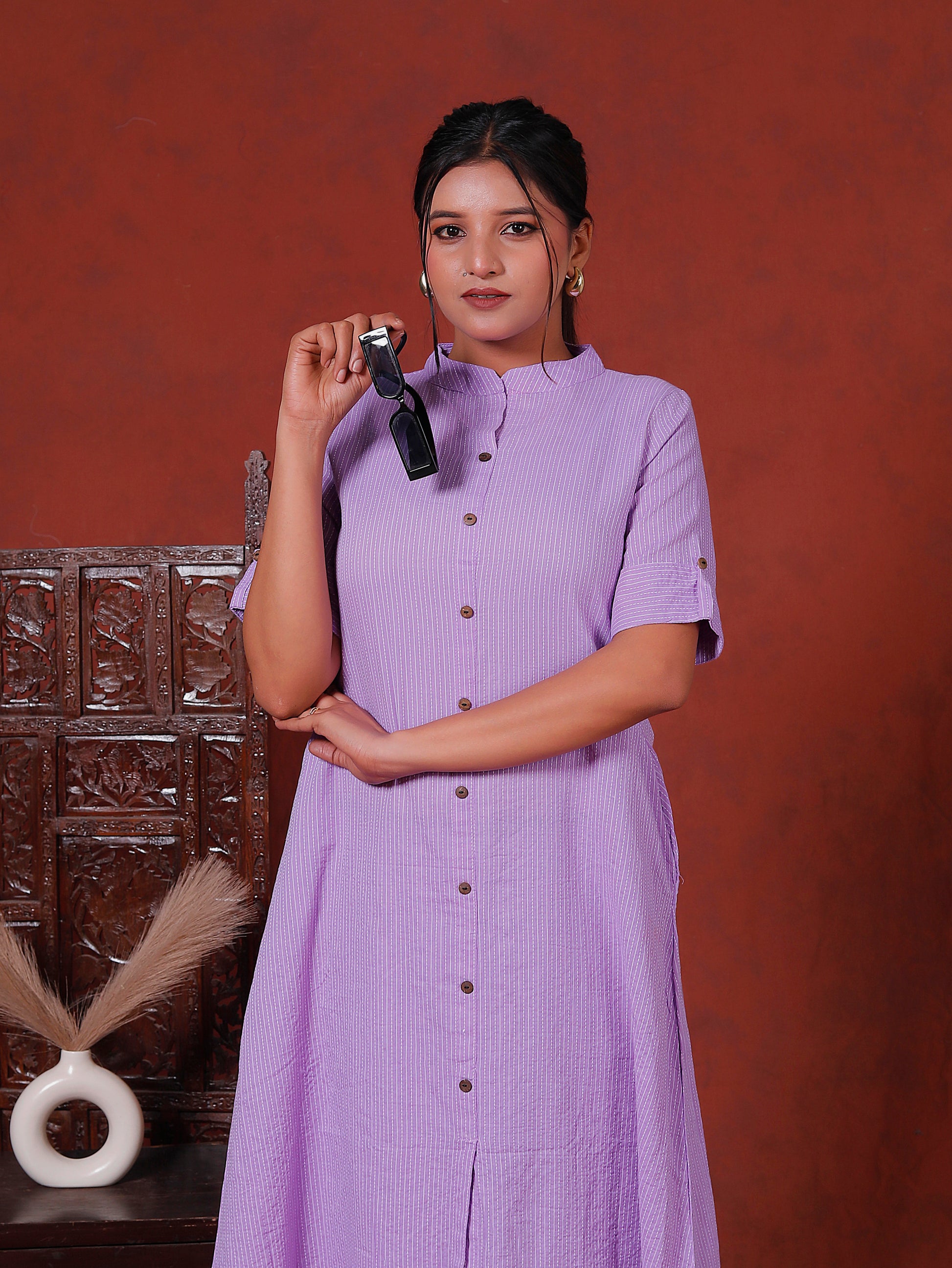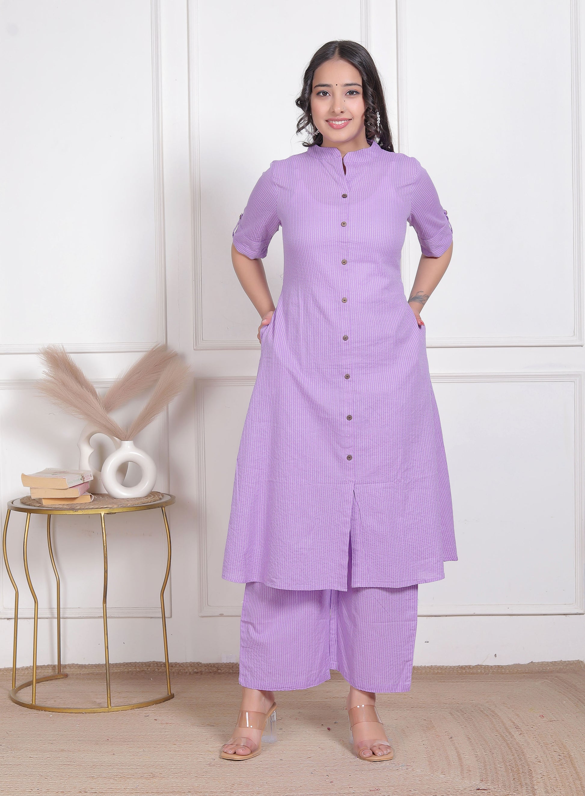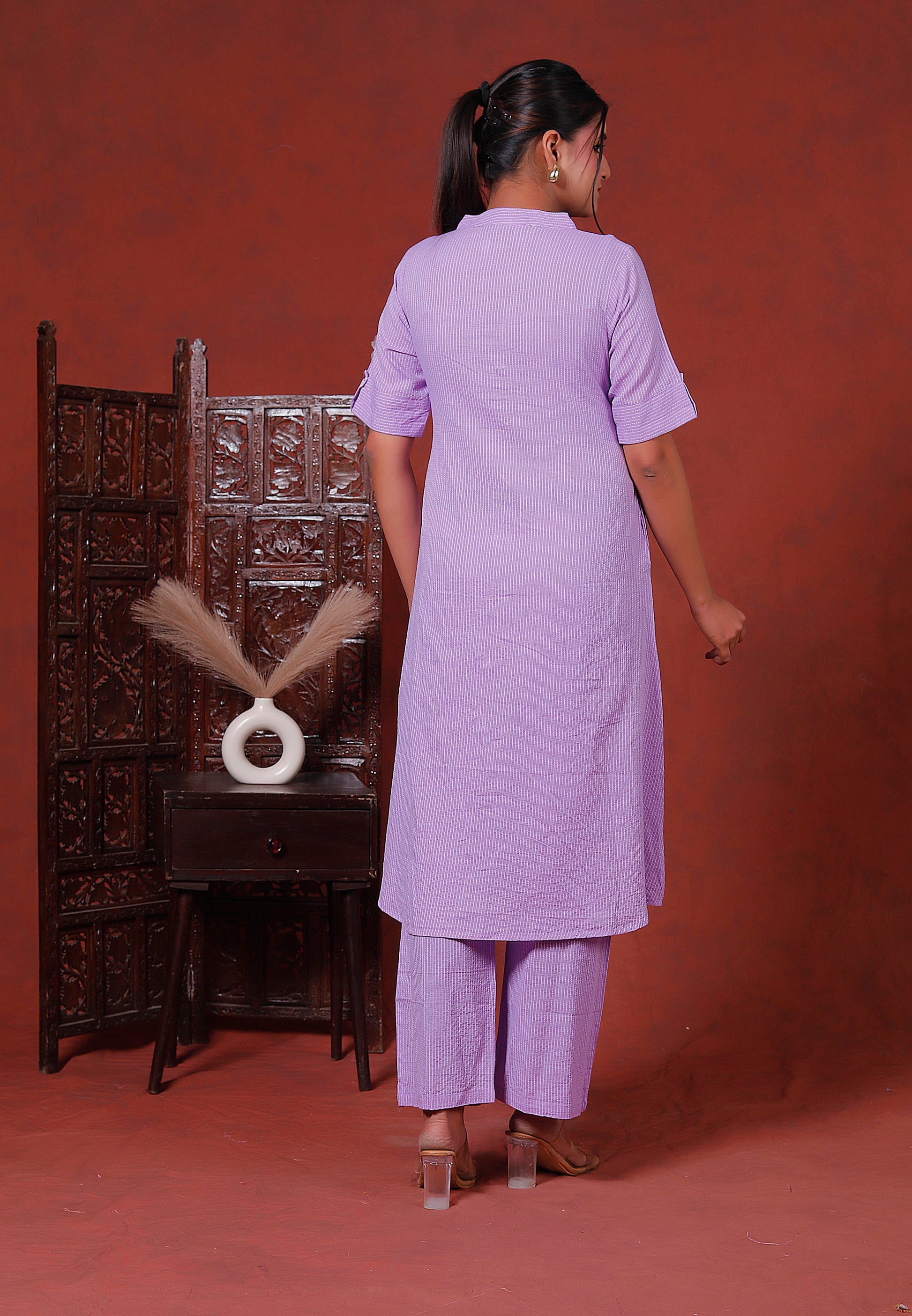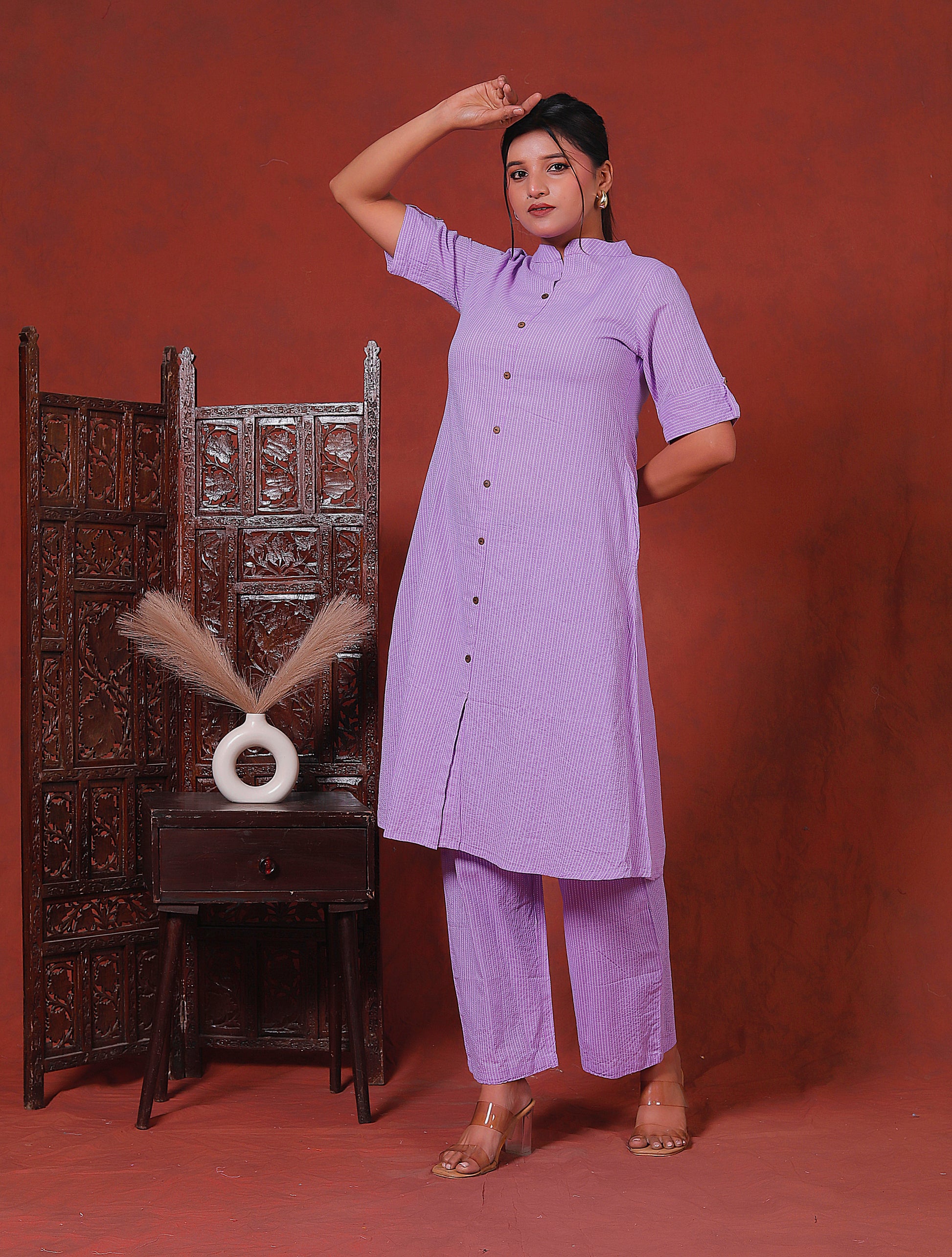 The clean, tailored kurta with delicate button detailing pairs seamlessly with straight-cut trousers, creating a polished yet relaxed ensemble suited for everyday professional wear. The airy cotton weave allows the skin to breathe, making it ideal for long work hours and warm climates, while its minimal aesthetic ensures timeless versatility.