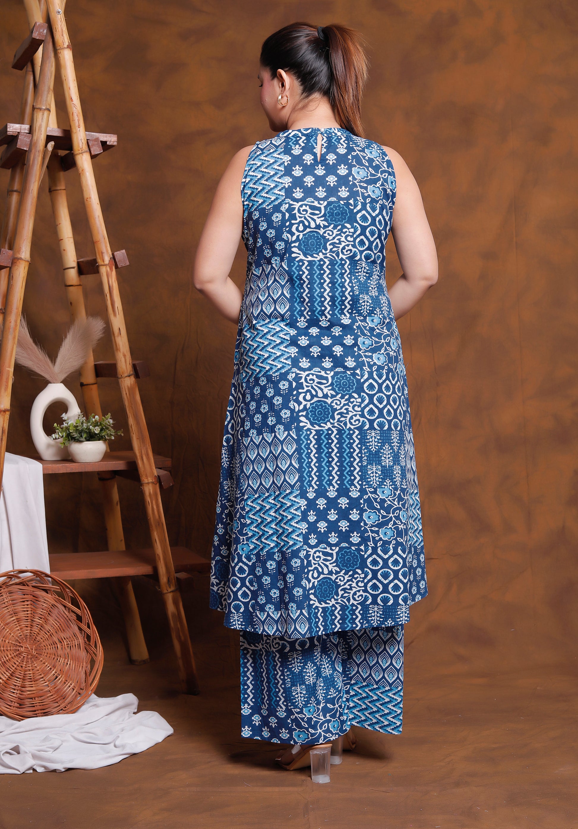 The panelled patchwork print in deep indigo tones adds quiet character, while the corset-inspired silhouette gently defines the waist without compromising ease of movement. Designed to transition seamlessly from casual office meetings to relaxed social occasions, this piece balances professionalism with effortless grace.